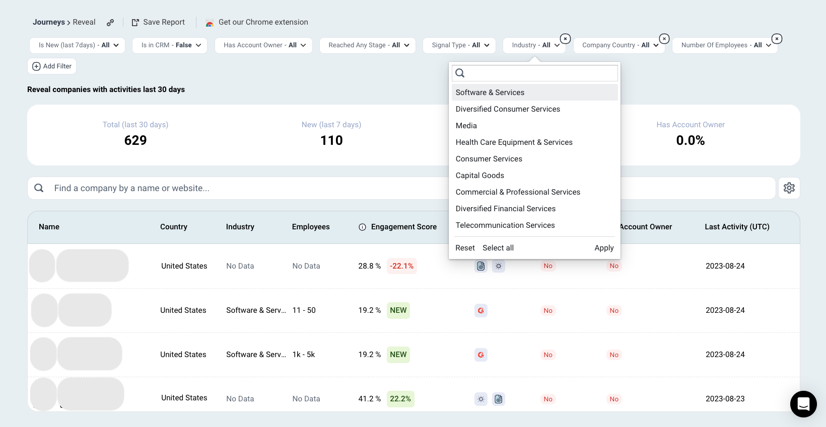 By integrating your CRM you can unlock Reveal’s full potential and determine whether or not these companies are already on your Sales team’s radar and whether they have been assigned an account owner. You’ll also be able to track account engagement across pipeline stages to help your Sales team prioritise their prospects.