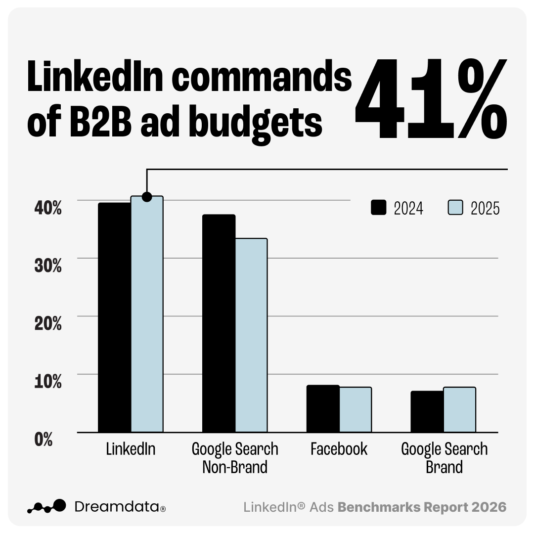 LinkedIn now commands 41% of total B2B ad budgets, up 2% since last year. It’s still the largest single advertising investment for B2B companies.