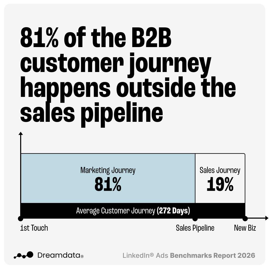 Below are some of our personal highlights from Dreamdata’s 2026 LinkedIn Ads Benchmarks Report, built on our customers aggregated data across 66M+ sessions and 3.5M+ customer journeys.