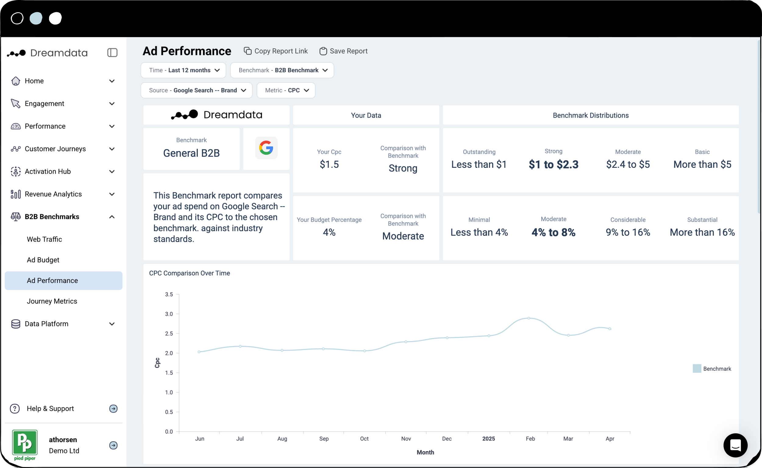 Source: Dreamdata B2B Benchmark report. This platform screenshot shows the month over month increase in CPC.