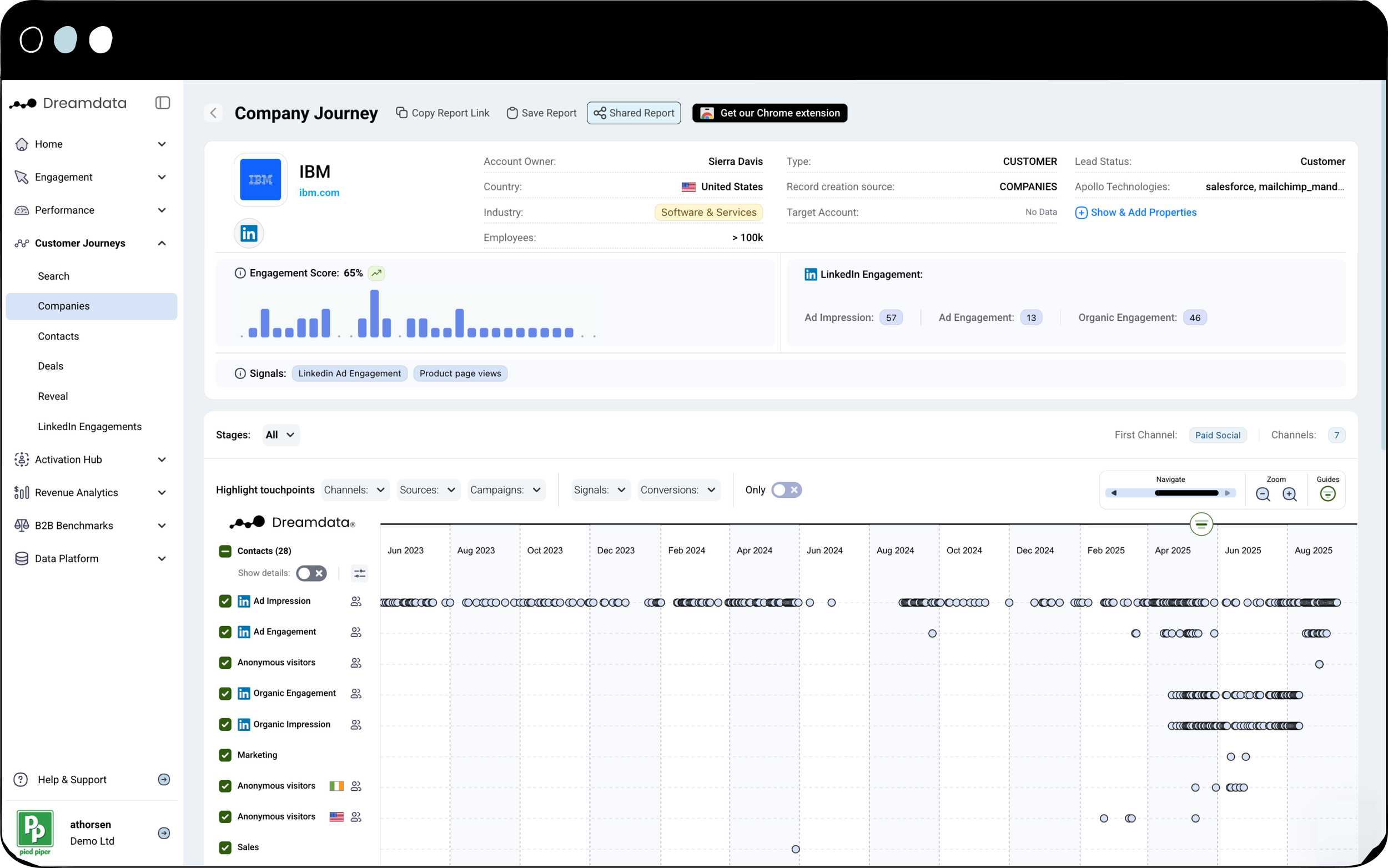 Here’s what changed: As always, we automatically unify all your GTM data, including LinkedIn, to provide the most complete B2B customer journey map on the market. With LinkedIn's new Company Intelligence API, Dreamdata now pulls more company-level insights, including organic impressions and engagement (for the first time!), directly from LinkedIn.