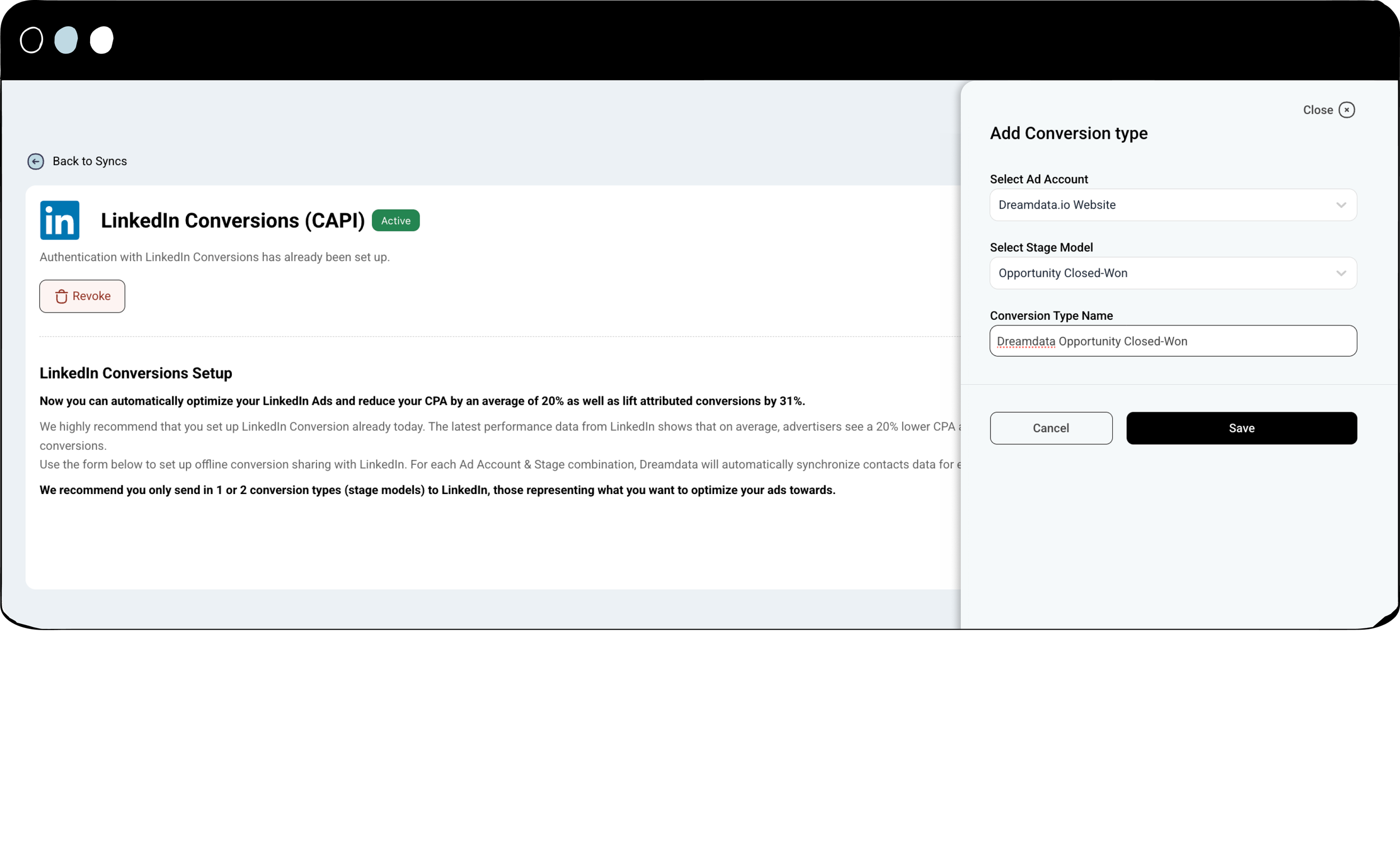 What you get: With more companies now surfaced through LinkedIn's new Company Intelligence API, Dreamdata’s LinkedIn CAPI integration becomes even more impactful. You can send more complete pipeline and conversion data back to LinkedIn automatically.