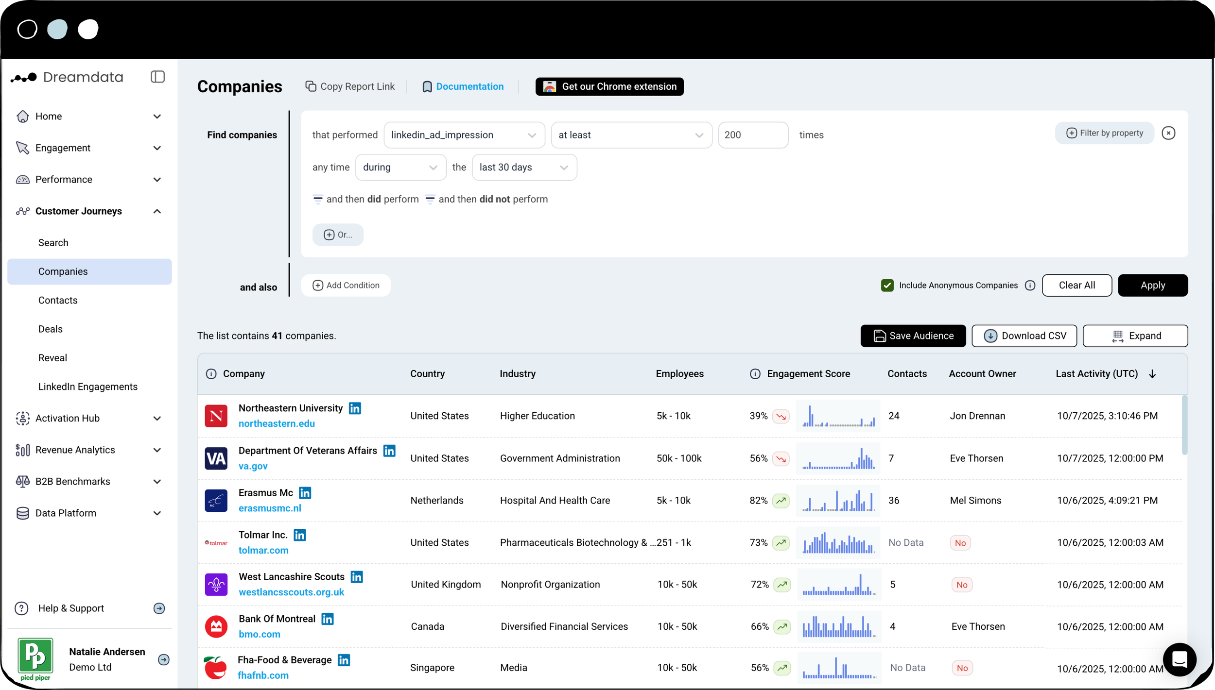 Because Dreamdata leverages LinkedIn's Company Intelligence API, you get more complete company-level insights, including organic impressions and engagement insights, directly from LinkedIn. In our own tests, we’ve seen up to a 10x increase in companies reached.