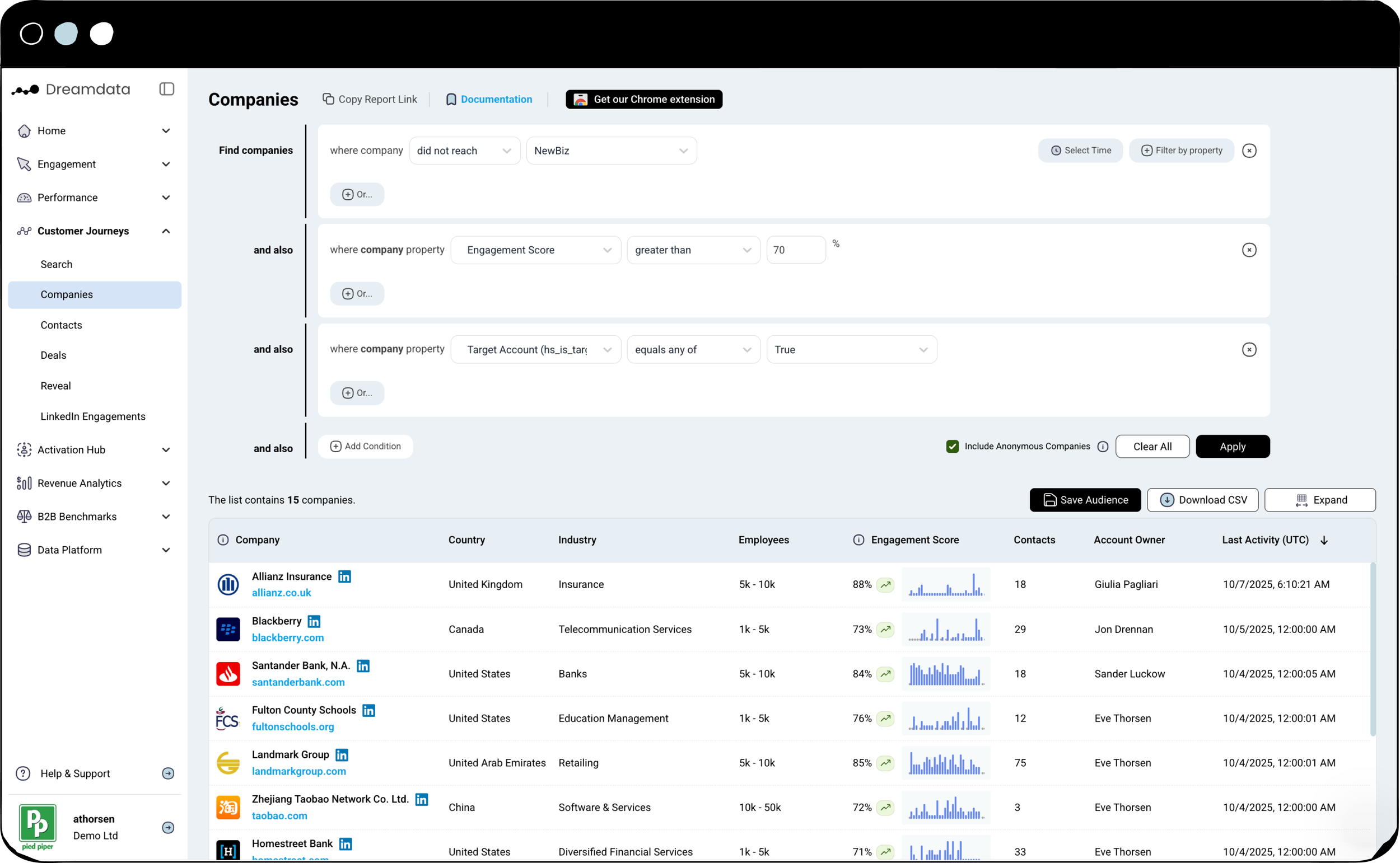 In the “Activation Hub” > “Audiences”, create a “+New Audience” >”+Companies”.