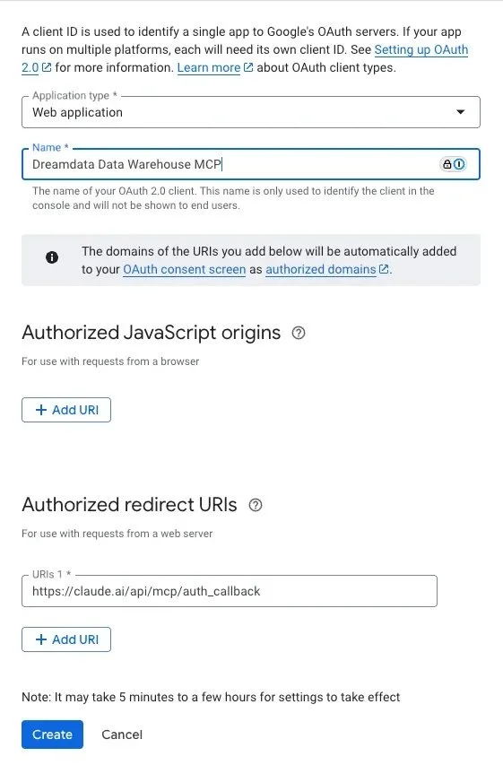 2. Create an OAuth application to allow your users to authenticate with the MCP server. In the Google Cloud console, go to Google Auth Platform > Clients > Create client.