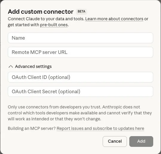 1. As an admin in Claude AI, create a Custom Connector. Use the following values: