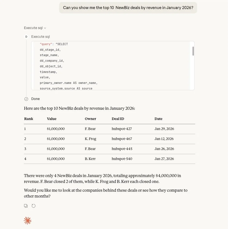 Use cases are not limited to data analysis. Because this the data is exposed through an MCP tool, anything your agent is capable of can use your Data Warehouse data for context. For example, you could build custom agentic workflows (e.g. trigger an action when the data changes).