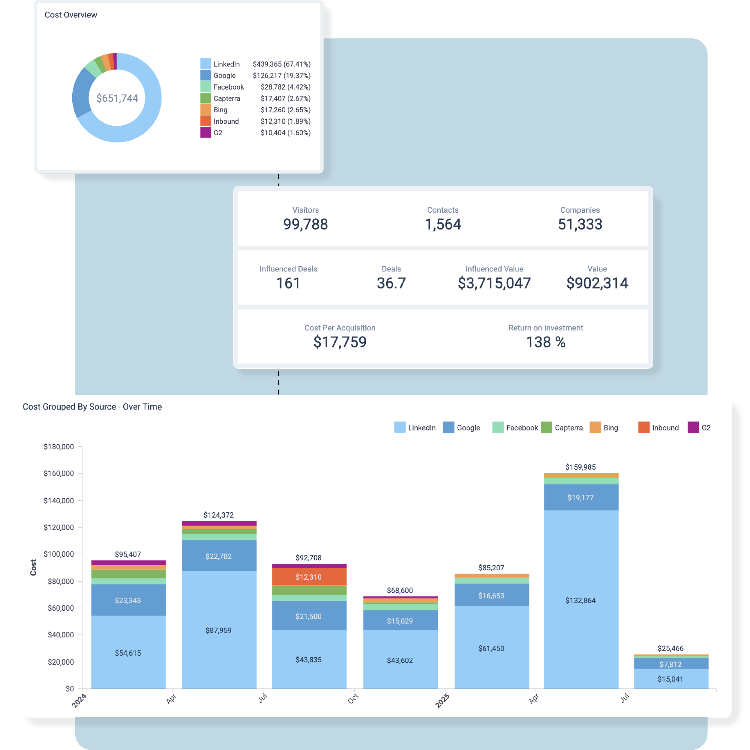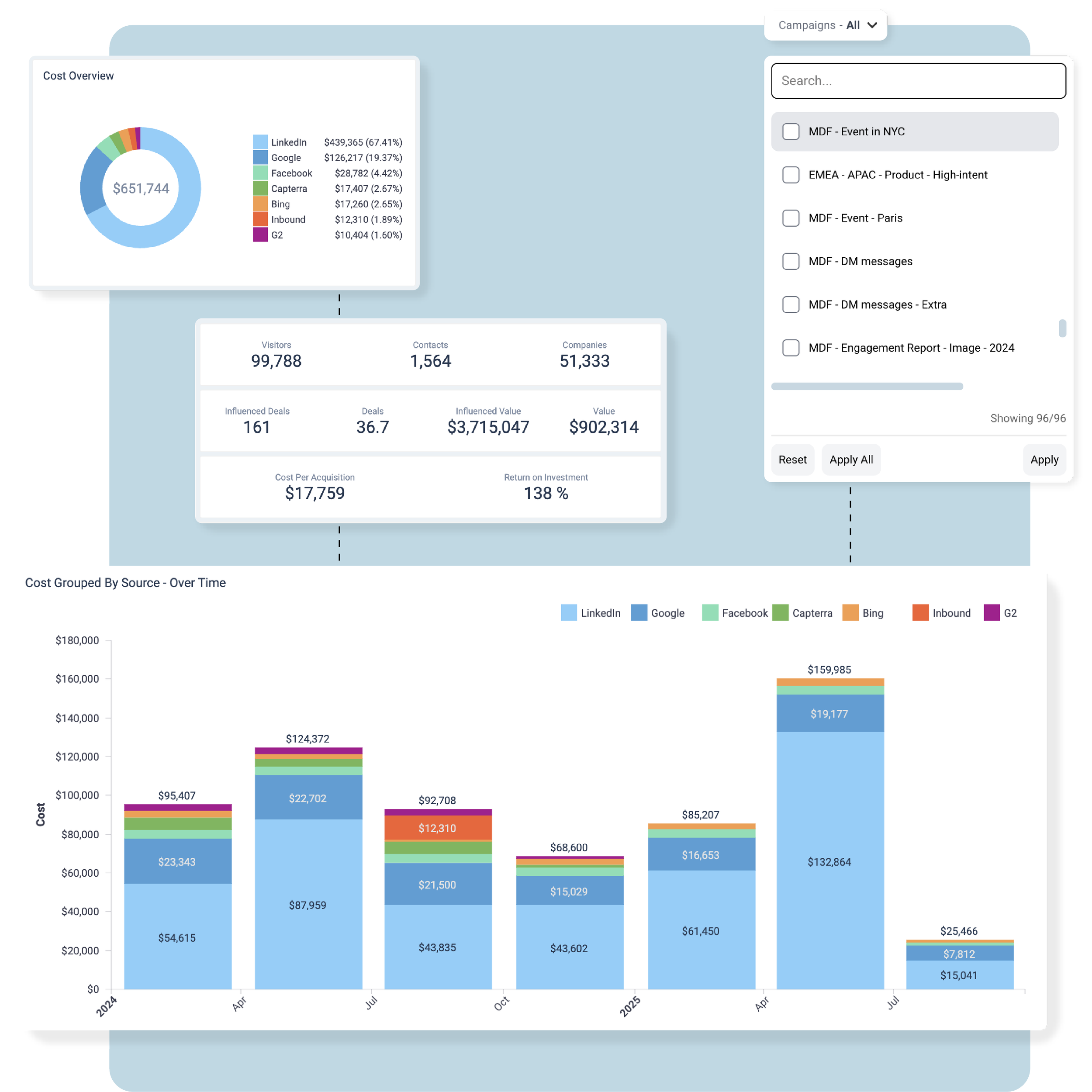 Compare the ROI of every channel (paid ads, social media, events, etc.) side-by-side. No more jumping between spreadsheets.