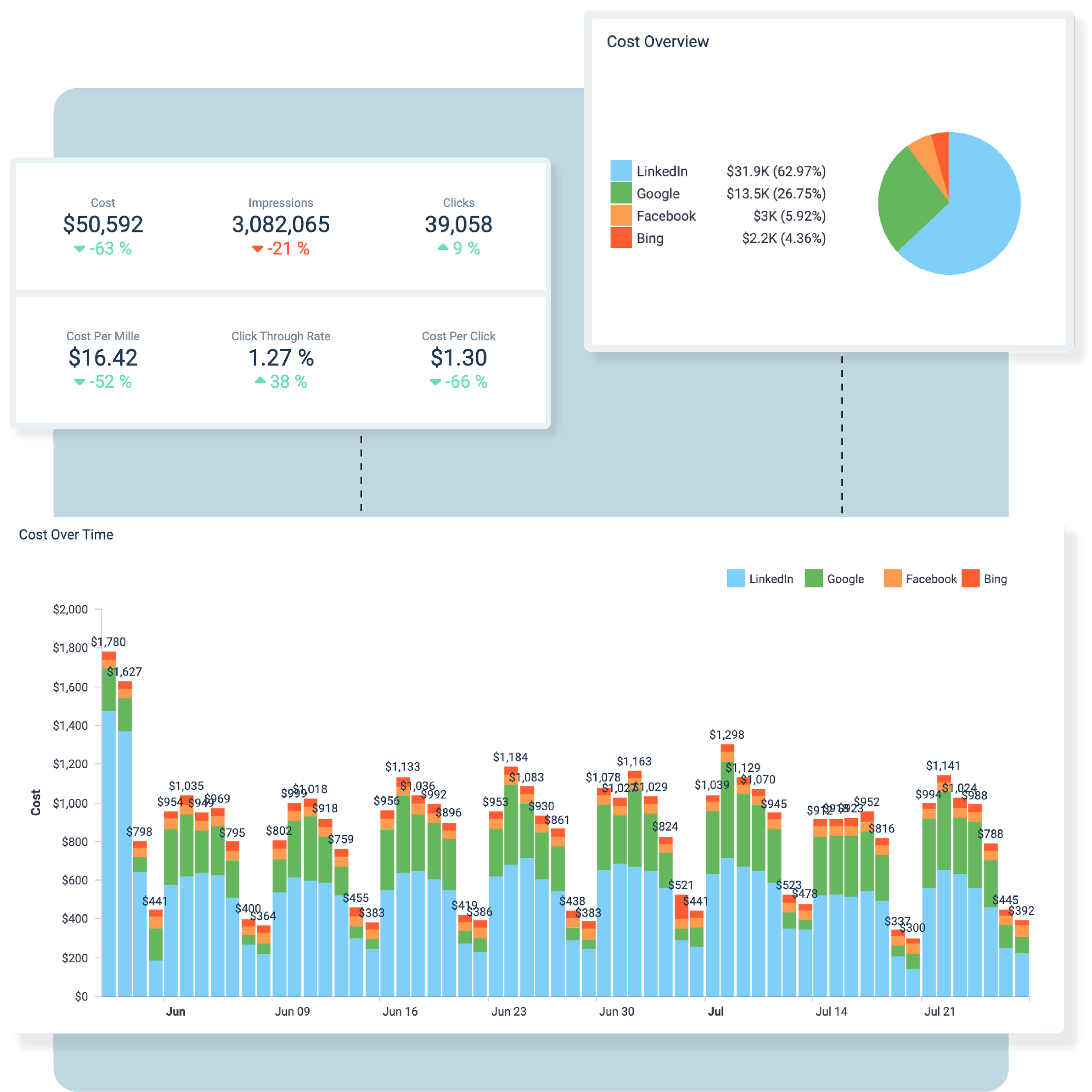 Drill down into your spend by campaign, source, and time period.