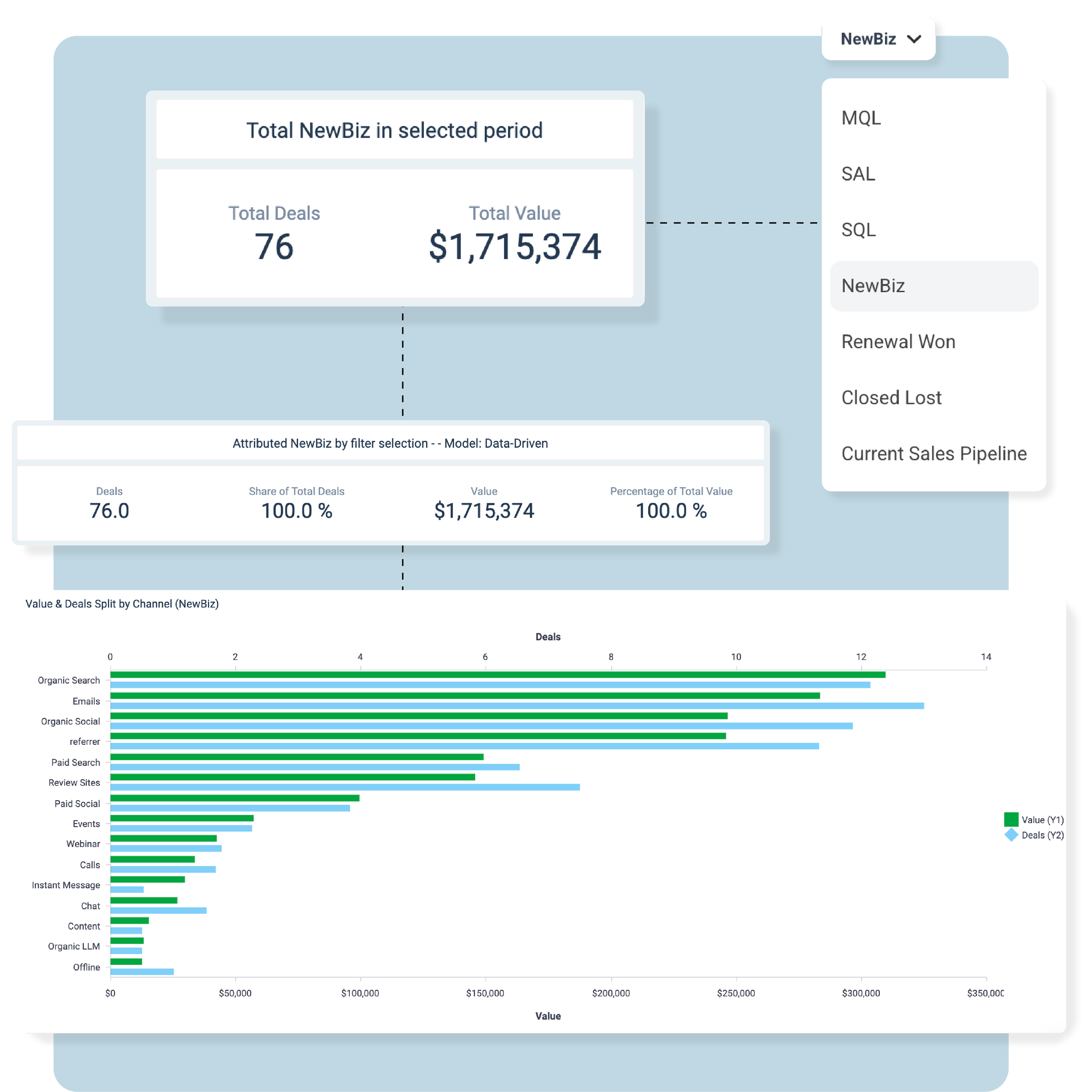 See how each marketing activity, from offline events to ad campaigns, contributes to revenue generation, not just the first and last touch.